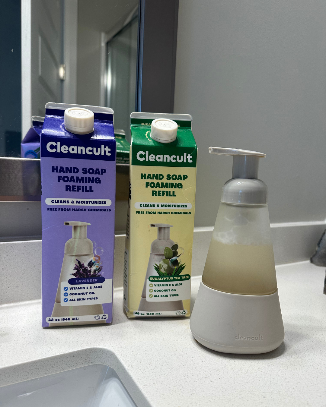 One of the best parts about swapping to eco-friendly cleaning products is the easy refill system. You buy a product in bulk and then refill your dispenser. Clean cult’s refills come in a paper based cartoon that you can add to their no slip shatter resistant refillable foamy soap dispenser. And let's be real…foamy hand soap is superior. Bonus: they have so many delicious scents.